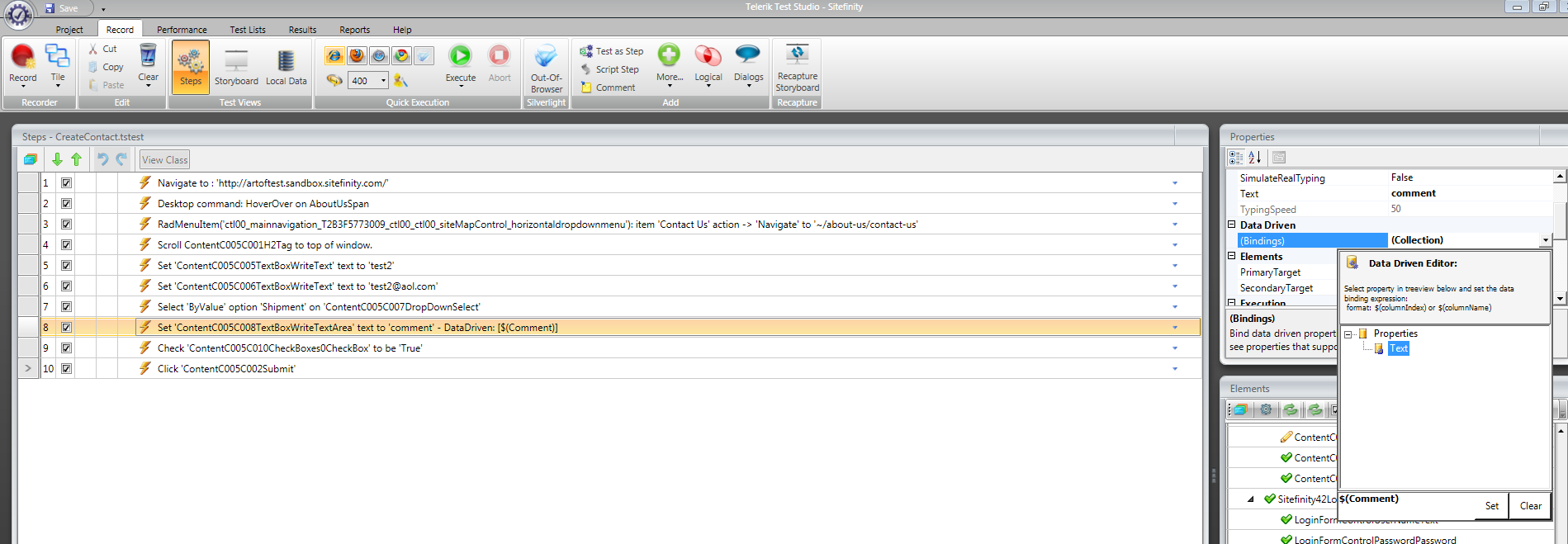 The CreateContact test fills in information on the form and submits it. The Message text box entry step is bound to the "Comment" column in the data.