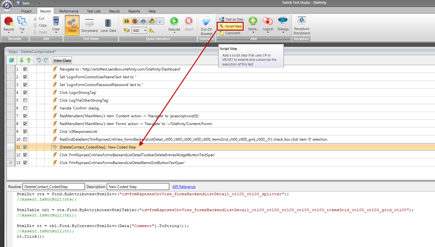 - The DeleteContact child test. Step 11 is the coded step that clicks the appropriate area of the table that contains the data from the "Comment" column.