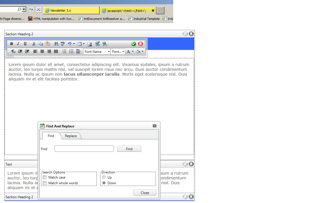 IE9 - When I click on the canned Find and Replace in a RadEditor toolbar a new window or tab is loading with javacript'<html></html>' showing in the tab...see attached picture.