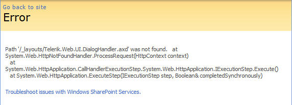 <system.web>..... <httpHandlers> <remove verb="GET,HEAD,POST" path="*" /> <add verb="GET,HEAD,POST" path="*" type="Microsoft.SharePoint.ApplicationRuntime.SPHttpHandler, Microsoft.SharePoint, Version=12.0.0.0, Culture=neutral, PublicKeyToken=71e9bce111e9429c" /> <add verb="OPTIONS,PROPFIND,PUT,LOCK,UNLOCK,MOVE,COPY,GETLIB,PROPPATCH,MKCOL,DELETE,(GETSOURCE),(HEADSOURCE),(POSTSOURCE)" path="*" type="Microsoft.SharePoint.ApplicationRuntime.SPHttpHandler, Microsoft.SharePoint, Version=12.0.0.0, Culture=neutral, PublicKeyToken=71e9bce111e9429c" /> <add verb="*" path="Reserved.ReportViewerWebControl.axd" type="Microsoft.Reporting.WebForms.HttpHandler, Microsoft.ReportViewer.WebForms, Version=8.0.0.0, Culture=neutral, PublicKeyToken=b03f5f7f11d50a3a" /> <!--Ajax--> <add verb="*" path="*.asmx" validate="false" type="System.Web.Script.Services.ScriptHandlerFactory, System.Web.Extensions, Version=3.5.0.0, Culture=neutral, PublicKeyToken=31BF3856AD364E35" /> <add verb="*" path="*_AppService.axd" validate="false" type="System.Web.Script.Services.ScriptHandlerFactory, System.Web.Extensions, Version=3.5.0.0, Culture=neutral, PublicKeyToken=31BF3856AD364E35" /> <add verb="GET,HEAD" path="ScriptResource.axd" type="System.Web.Handlers.ScriptResourceHandler, System.Web.Extensions, Version=3.5.0.0, Culture=neutral, PublicKeyToken=31BF3856AD364E35" validate="false" /> <!--End Ajax--> <!-- Telerik--> <add path="Telerik.Web.UI.WebResource.axd" type="Telerik.Web.UI.WebResource" verb="*" validate="false" /><add path="~\Telerik.Web.UI.DialogHandler.axd" verb="*" type="Telerik.Web.UI.DialogHandler" validate="false" /> <!-- End Telerik--> <add verb="*" path="*AsyncLeftNavHandler.ashx" type="DTAC.NCCA.DCARE.MenuLoading.Provider.AsyncMenuHandler, DTAC.NCCA.DCARE.MenuLoading, Version=1.0.0.0, Culture=neutral, PublicKeyToken=6bb9e1869a4e4d4c" validate="false" /> </httpHandlers>
