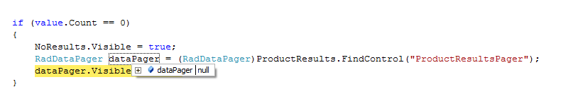 | RadDataPager dataPager = (RadDataPager)ProductResults.FindControl("ProductResultsPager"); |