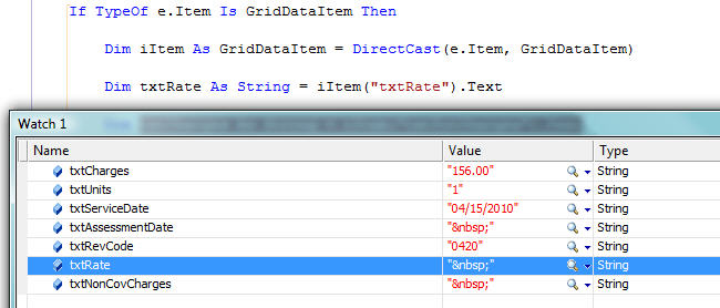 That did it, thank you. I did find something very odd though when binding the data. If a datacolumn in a datatable has a NULL value (this is what is in the SQL database), the griddataitem text returns " " instead of the empty string. See the attached screen shot. This has to be a bug because how would you every test for string.isnullorempty