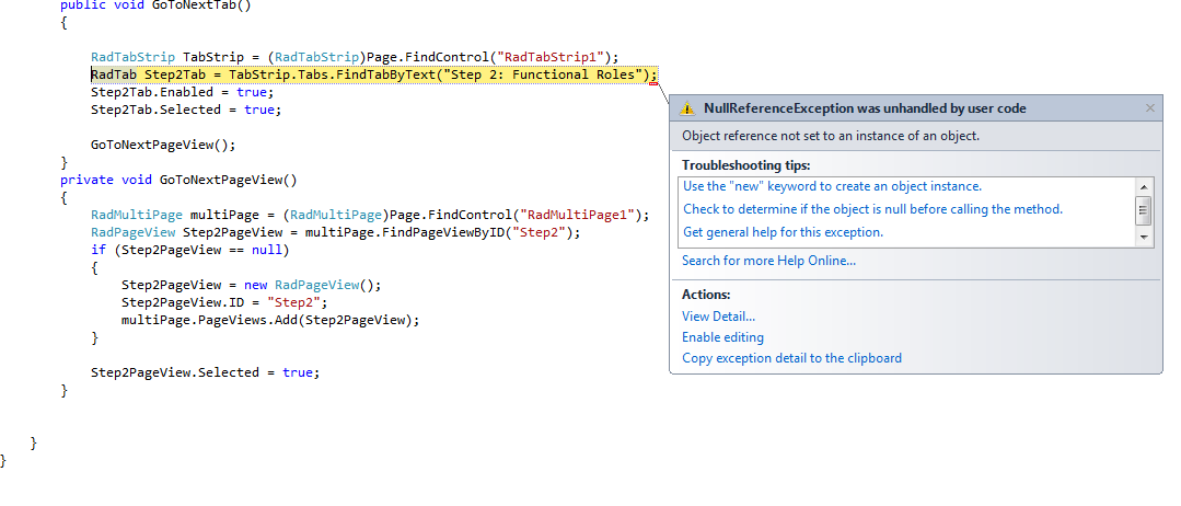 I followed the Telerik Wizard demo to achieve this and I can see from other people's questions in the forum that this is a very common error to have. However none of the recommended solutions seemed to work for me.