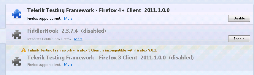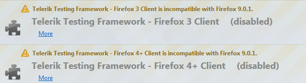 I did some digging and ended up looking into the extensions that are installed. I found that the Telerik Testing Framework Firefox 4+ client is disabled because is it "incompatible with Firefox 9.0.1".