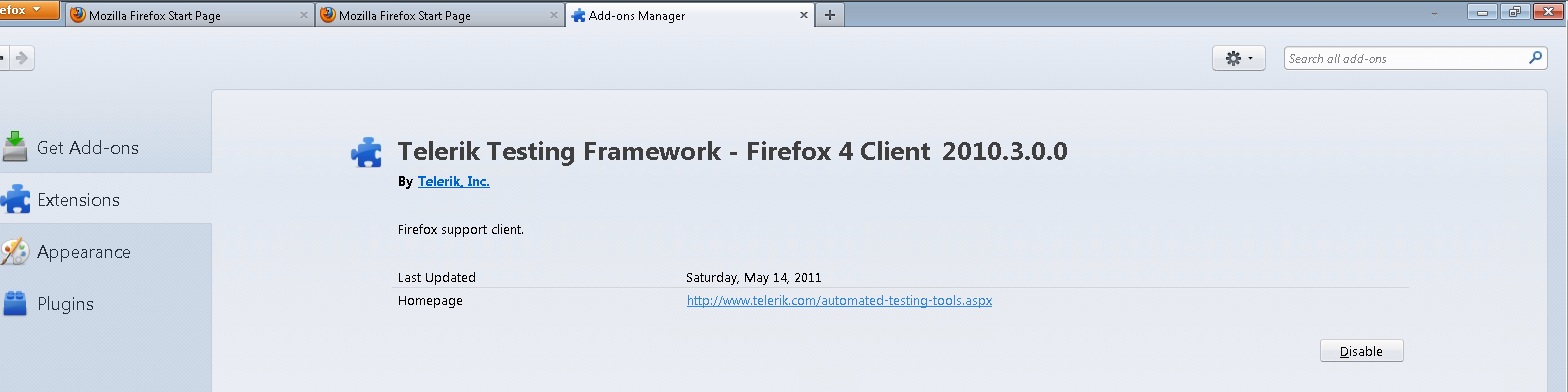 I have just installed Telerik Testing Framework 2011.1.502 and when I opened the Extensions tab in the Tools / Add-ons of Firefox, I get the extension reported as in the attached screenshot (refers to 2010.3 client).