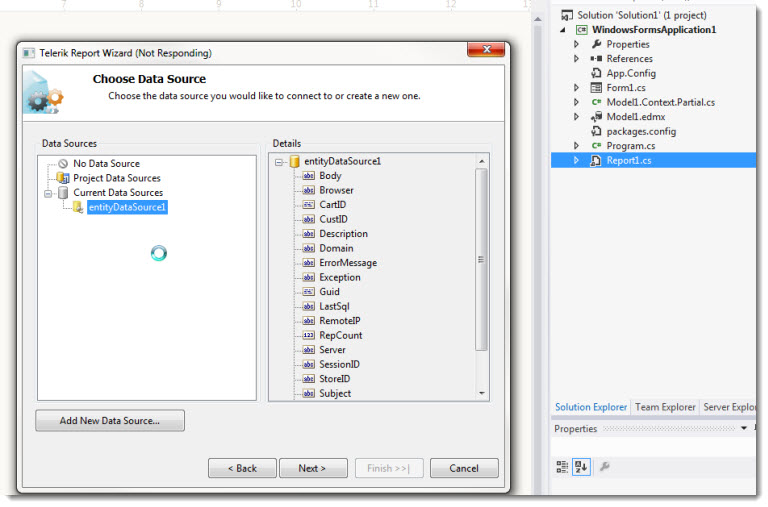 I created a Web Form project. Added an EF model and then added the reporting item. I am going thru the wizard and thought I got hung up (see attachment) but eventually it did advance after several attempts. When I clicked on the entityDataSource1 and Finish button, it was busy for a minute and then stopped being busy and re-enabled the Finish button. It eventually did advance to the next page.