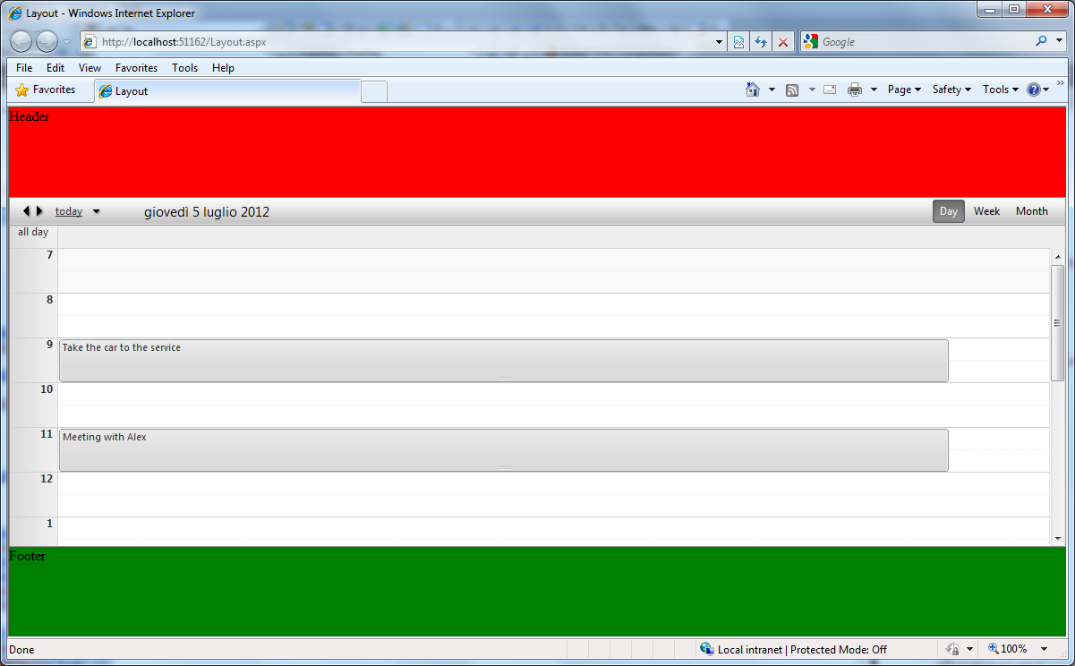 <%@ Page Language="C#" AutoEventWireup="true" CodeBehind="Layout.aspx.cs" Inherits="Prime.Layout" %><%@ Register Assembly="Telerik.Web.UI" Namespace="Telerik.Web.UI" TagPrefix="telerik" %><!DOCTYPE html><html xmlns="http://www.w3.org/1999/xhtml"><head runat="server"> <title>Layout</title> <script src="Scripts/jquery-1.4.1.js" type="text/javascript"></script> <style type="text/css"> body { margin: 0; } div#header { background: red; position: fixed; top: 0; left: 0; height: 100px; width: 100%; } div#content { background: yellow; margin-top: 100px; width: 100%; } div#footer { background: green; position: fixed; bottom: 0; left: 0; height: 100px; width: 100%; } img { border: 1px solid purple; } </style> <script type="text/javascript"> </script> <telerik:radcodeblock id="RadCodeBlock1" runat="server"> <script type="text/javascript"> $(document).ready(function () { setContentHeight(); $(window).resize(function () { resizeContent(); }); }); function pageLoad() { refreshScheduler(); } function setContentHeight() { $('#content').css('height', $(window).height() - $('#header').height() - $('#footer').height()); //alert($('#content').css('height')); } function resizeContent() { setContentHeight(); refreshScheduler(); } function refreshScheduler() { var scheduler = $find('<%=RadScheduler1.ClientID %>'); //alert(scheduler.get_id() + " " + $('#content').css('height')); scheduler.get_element().style.height = $('#content').css('height'); scheduler.repaint(); } </script></telerik:radcodeblock></head><body> <form id="form1" runat="server"> <telerik:radscriptmanager runat="server" id="RadScriptManager1" /> <telerik:radajaxmanager id="RadAjaxManager1" runat="server"> <AjaxSettings> <telerik:AjaxSetting AjaxControlID="RadScheduler1"> <UpdatedControls> <telerik:AjaxUpdatedControl ControlID="RadScheduler1" LoadingPanelID="RadAjaxLoadingPanel1" /> </UpdatedControls> </telerik:AjaxSetting> </AjaxSettings> </telerik:radajaxmanager> <telerik:radajaxloadingpanel id="RadAjaxLoadingPanel1" runat="server" skin="Default" /> <div id="header"> Header</div> <div id="content"> <telerik:radscheduler runat="server" id="RadScheduler1" daystarttime="07:00:00" dayendtime="22:00:00" timezoneoffset="03:00:00" onappointmentinsert="RadScheduler1_AppointmentInsert" onappointmentupdate="RadScheduler1_AppointmentUpdate" onappointmentdelete="RadScheduler1_AppointmentDelete" datakeyfield="ID" datasubjectfield="Subject" datastartfield="Start" dataendfield="End" datarecurrencefield="RecurrenceRule" datarecurrenceparentkeyfield="RecurrenceParentId" datareminderfield="Reminder" showfulltime="false" showfooter="false" width="100%"> <AdvancedForm Modal="true" /> <TimelineView UserSelectable="false" /> <TimeSlotContextMenuSettings EnableDefault="true" /> <AppointmentContextMenuSettings EnableDefault="true" /> <Reminders Enabled="true" /> </telerik:radscheduler> </div> <div id="footer"> Footer</div> </form></body></html>0