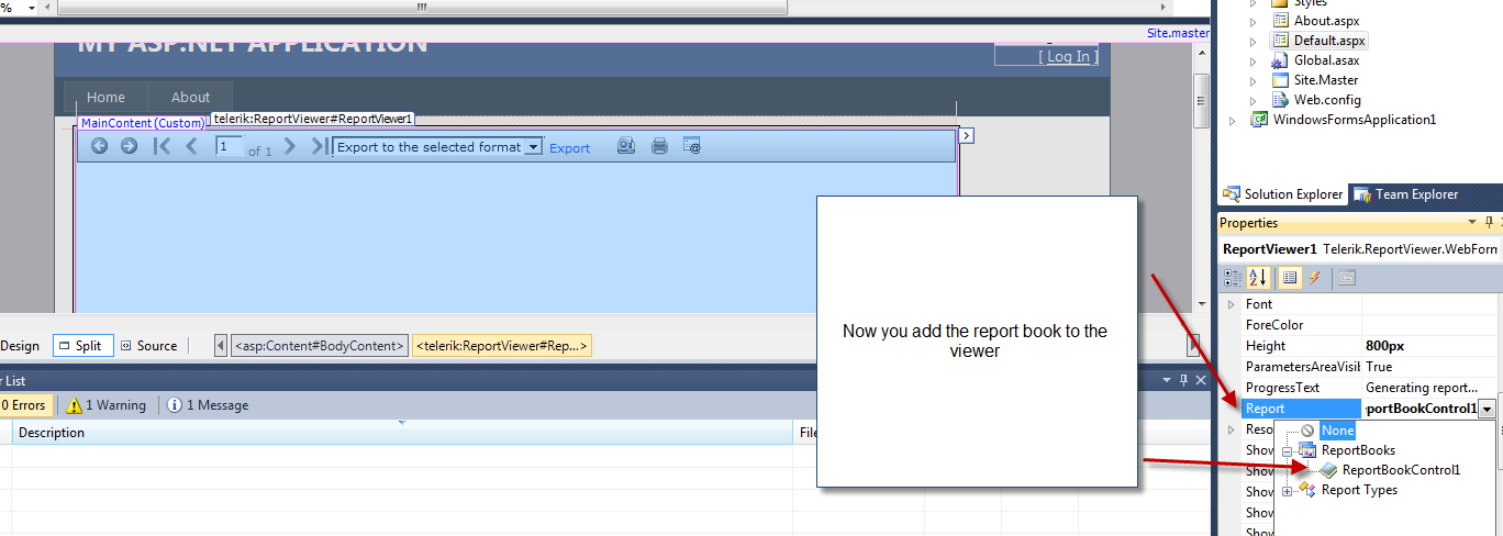 I've had an existing aspx website i've been working on and today i've installed the Telerik tools. I created a new webpage using my template and CSS and I wanted to test out the ReportBookControl. I went ahead and dropped the ReportBookControl in the section I wanted inside of the html table I wanted it placed. I then went ahead and added a Telerik Report and then used the wizard to create the report.