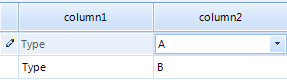 If I understand your requirement correctly you are trying to assign a fixed text "Type" for the first column and fixed two values, "A" and "B", for the second column. For the first column you can use a simple GridViewTextBoxColumn and specify the default text for that cell. In addition, in the DefaultValuesNeeded event you can set this specific string as default value for the cell. As to the second column, since you have two options, I would recommend you to use a GridViewComboBoxColumn. You can find below a sample code snippet which result is illustrated in the screenshot: