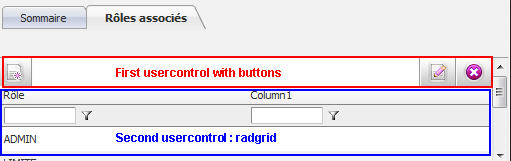 The first usercontrol contains buttons, the second contains a radgrid.