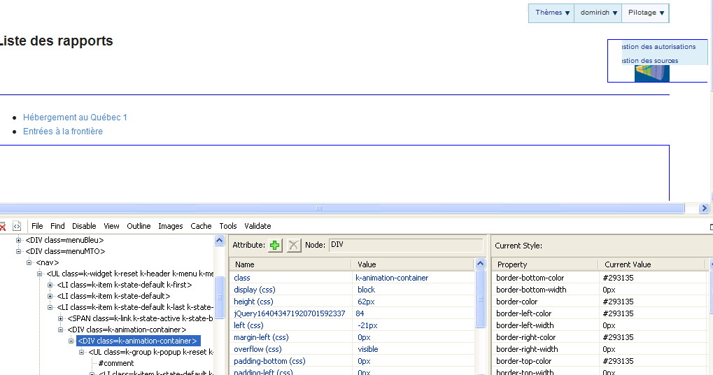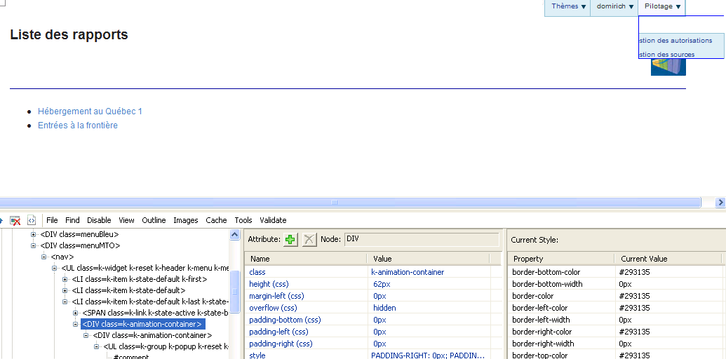 <ul id="kendoMenu"> <li><a href="/">Thèmes</a> <ul> <li<a href="/Rapports/HEB_QUE">Hébergement au Québec 1</a></li> <li><a href="/Rapports/ENT_FRO">Entrées à la frontière</a></li> </ul> </li> <li>domirich <ul> <li><a href="/Account/LogOff">Déconnexion</a></li> </ul> </li> <li>Pilotage <ul> <li><a href="/Pilotage/Autorisations">Gestion des autorisations</a></li> <li><a href="/Pilotage/Sources">Gestion des sources</a></li> <li><a href="/Pilotage/Concepts">Gestion des thèmes</a></li> </ul> </li></ul>And here how I initialise the menu :