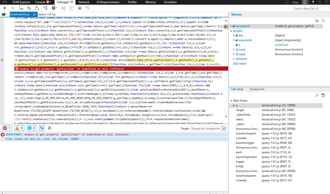 Was this bug ever fixed? I am using Kendo version v2015.2.624 and I keep running into this error. I'm using the Kendo Scheduler in timeline view, and when a user clicks on a timeslot, I automatically create an event in that timeslot. The issue is that about 1 in every 3 or 4 times I run the application, I get this same "Unable to get property 'getFullYear' of undefined or null reference" error, but only when clicking on certain timeslots. I can't seem to find any pattern as to when or why some of the slots give this error when clicked, whereas the majority of the others all work fine. Attached is the error and place in the Kendo code that the error is thrown.