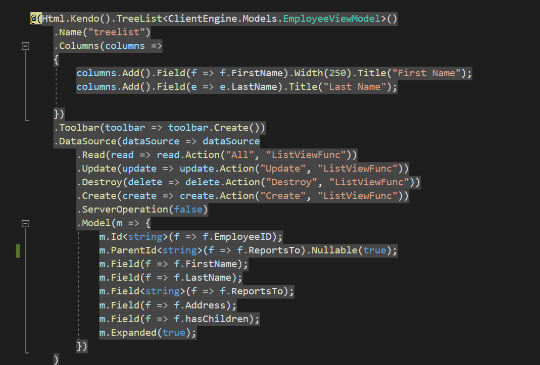 Please find attached your demo revised and displaying the data in a Kendo TreeList view.