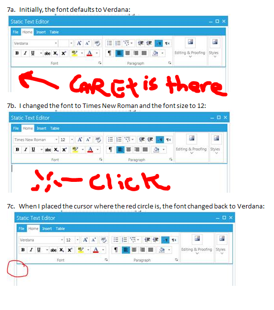 If the user changes the font from the default, say from Verdana to Times New Roman, then clicks anywhere within the RRTB as if they were bringing focus back to it, the font changes back to the default (Verdana in this example).