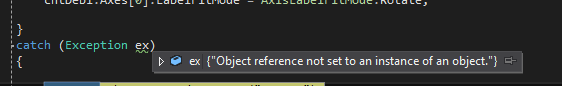 Dim HA As LinearAxis = DashBoard.chtNewDayAvg.Axes.[Get](Of LinearAxis)(0)Dim AL As AxisLabelElement = DirectCast(HA.Children(1), AxisLabelElement)AL.ForeColor = Color.WhiteIf RecHasData(Counts) Then 'Play with the 30 day rolling avg. DashBoard.chtNewDayAvg.ShowLegend = False DashBoard.chtNewDayAvg.Series(0).DataPoints.Clear() 'Not sure about the areas For I As Integer = 0 To UB(Counts) Dim Statuses As New List(Of String) Statuses.AddRange(Split(GetFromSet(Counts, 1, I), Separator2)) Dim AssetsDown As Integer = 0 For II As Integer = 0 To Statuses.Count - 1 Dim Val As Integer Integer.TryParse(Statuses(II).Split(Separator)(AssetTypeSlot), Val) Select Case Statuses(II).Split(Separator)(0) Case "Down" AssetsDown += Val : If Val > MaxDwn Then MaxDwn = Val Case "Repairing" AssetsDown += Val : If Val > MaxDwn Then MaxDwn = Val End Select Next Dim DT As String = FMDB(GetFromSet(Counts, 0, I), False).ToShortDateString Dim P As New CategoricalDataPoint(AssetsDown, DT) P.Label = AssetsDown DashBoard.chtNewDayAvg.Series(0).DataPoints.Add(P) Next Dim HA As LinearAxis = DashBoard.chtNewDayAvg.Axes.[Get](Of LinearAxis)(0) Dim AL As AxisLabelElement = DirectCast(HA.Children(0), AxisLabelElement) AL.ForeColor = Color.WhiteEnd IfHA is nothing, so I get an Object Reference error on the second line where it tries to get the children.