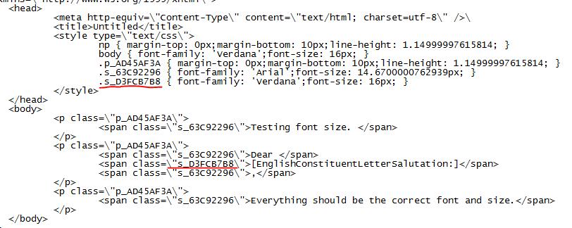 <!DOCTYPE html PUBLIC "-//W3C//DTD XHTML 1.0 Transitional//EN" "http://www.w3.org/TR/xhtml1/DTD/xhtml1-transitional.dtd"[]><html xmlns="http://www.w3.org/1999/xhtml"> <head> <meta http-equiv="Content-Type" content="text/html; charset=utf-8" /> <title>Untitled</title> <style type="text/css">p { margin-top: 0px;margin-bottom: 10px;line-height: 1.14999997615814; } body { font-family: 'Verdana';font-size: 16px; } .p_AD45AF3A { margin-top: 0px;margin-bottom: 10px;line-height: 1.14999997615814; } .s_903713FB { font-family: 'Arial';font-size: 16px; } .s_D3FCB7B8 { font-family: 'Verdana';font-size: 16px; } </style> </head> <body> <p class="p_AD45AF3A"> <span class="s_903713FB">Testing font in merged fields. Everything should be Arial in here.</span> </p> <p class="p_AD45AF3A"> <span class="s_903713FB">Dear </span> <span class="s_D3FCB7B8">Rory</span> <span class="s_903713FB"></span> <span class="s_D3FCB7B8">McTory</span> <span class="s_903713FB"> ,</span> </p> <p class="p_AD45AF3A"> <span class="s_903713FB">This should all be Arial.</span> </p> <p class="p_AD45AF3A"> <span class="s_903713FB"> </span> </p> <p class="p_AD45AF3A"> <span class="s_903713FB"> </span> </p> </body></html><DIV id=cbftr align=center><BR><TABLE border=0 cellSpacing=0 cellPadding=0><TBODY><TR><TD align = "center" ><SPAN style="FONT-FAMILY: Arial; COLOR: #000000; FONT-SIZE: 10px">This email was sent to / Ce courriel a été envoyé à </SPAN><SPAN style="FONT-FAMILY: Arial; COLOR: #000000; FONT-SIZE: 10px">seanriedel@conservative.ca</SPAN><SPAN style="FONT-FAMILY: Arial; COLOR: #000000; FONT-SIZE: 10px">.</SPAN></TD></TR><TR><TD align = "center"><SPAN style="FONT-FAMILY: Arial; COLOR: #000000; FONT-SIZE: 10px"> </SPAN></TD></TR><TR><TD align = "center" ><SPAN style="FONT-FAMILY: Arial; COLOR: #000000; FONT-SIZE: 10px">Email communications from / Communications électroniques de la part de:</SPAN></TD></TR><TR><TD align = "center" ><SPAN style="FONT-FAMILY: Arial; COLOR: #000000; FONT-SIZE: 10px">Conservative Party of Canada, #1204 - 130 Albert Street, Ottawa, ON, Canada, K1P 5G4, <BR>Parti conservateur du Canada - 130 rue Albert, bureau 1204, Ottawa, Ontario, Canada, K1P 5G4.</SPAN></TD></TR><TR><TD align = "center"><SPAN style="FONT-FAMILY: Arial; COLOR: #000000; FONT-SIZE: 10px"> </SPAN></TD></TR><TR><TD align = "center" ><SPAN style="FONT-FAMILY: Arial; COLOR: #000000; FONT-SIZE: 10px">Click for immediate removal with / Veuillez cliquer afin d'être supprimé</SPAN></TD></TR><TR><TD align = "center" ><SPAN style="FONT-FAMILY: Arial; COLOR: #000000; FONT-SIZE: 10px">immédiatement de notre liste à l'aide de </SPAN><A href="http://software.clickback.com/external_pages/opt_out.aspx?lwjtoknmninvojnqnmnlnmntlhnknwnvoknmojonniolnqonnmjvnknijtkqkikpkkkojtkhjtkikhkqkqkqknjtkjkjkjkpkijtkkkikhkikhkokkkojtkjjtkkkikhkikhkokkkojtkqkikpkkko"><SPAN style="FONT-FAMILY: Arial; COLOR: #000000; FONT-SIZE: 10px">Safe<IMG border=0 src="http://software.clickback.com/images/letter.gif">Remove</SPAN></A><SPAN style="FONT-FAMILY: Arial; COLOR: #000000; FONT-SIZE: 10px">.</SPAN></TD></TR></TBODY></TABLE></DIV><br /><div align=center><br><br><table width='600' cellpadding=0 cellspacing=0 border=0><tr><td align = "center" rowspan=5 colspan=2 valign=bottom><span style='font-size:10pt;font-family:Arial;color:black;'></span></td></tr>And here is the code we use to export the document to html: