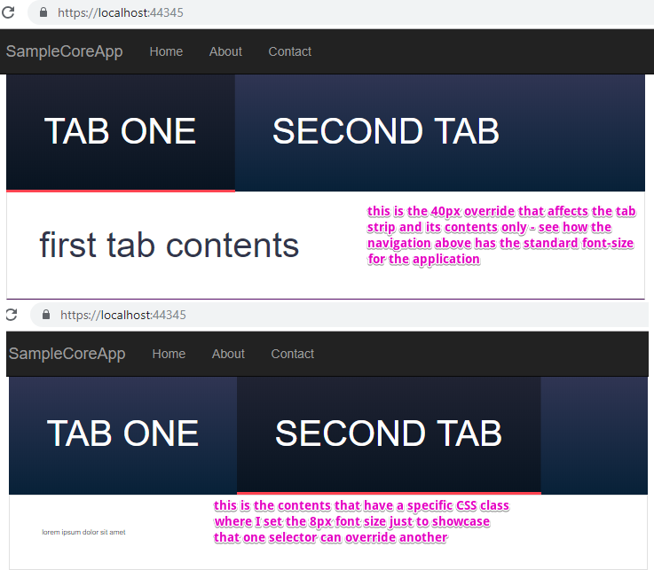 That said, here is an example I made for you that shows a few tricks to target tab strip and its contents with CSS selectors. Of course, the selector specificity determines what rule will take effect, so you may need to add something like the !important modifier to the rules so they can override the current ones you have (although I would recommend determining where the current ones come from and fixing them).