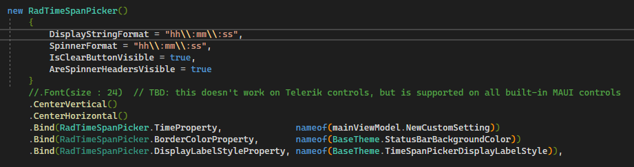 Finally, you can re-use any style that you've defined in as many places as you need to. For example, use the same Label style for the timeSpanPicker https://docs.telerik.com/devtools/maui/controls/timespanpicker/styling/styling