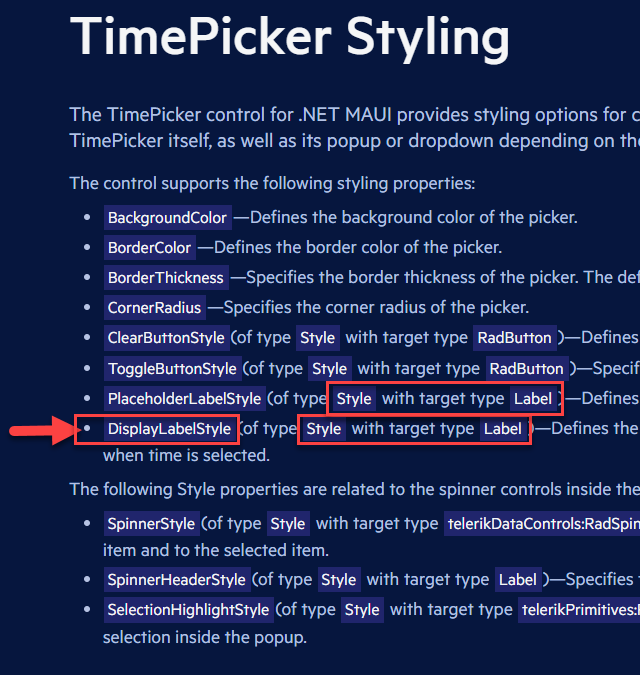 For example, TimePicker's article is https://docs.telerik.com/devtools/maui/controls/timepicker/styling/styling