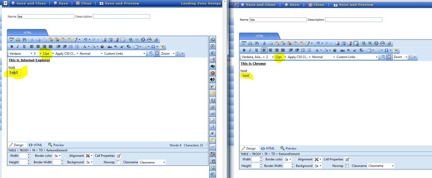 If you view the attached image, it will show that when I add a table cell and enter text into the cell... In IE the editor control automatically sets the font size to 12pt but in Chrome it is automatically set to 12px resulting in different text sizes across browsers.