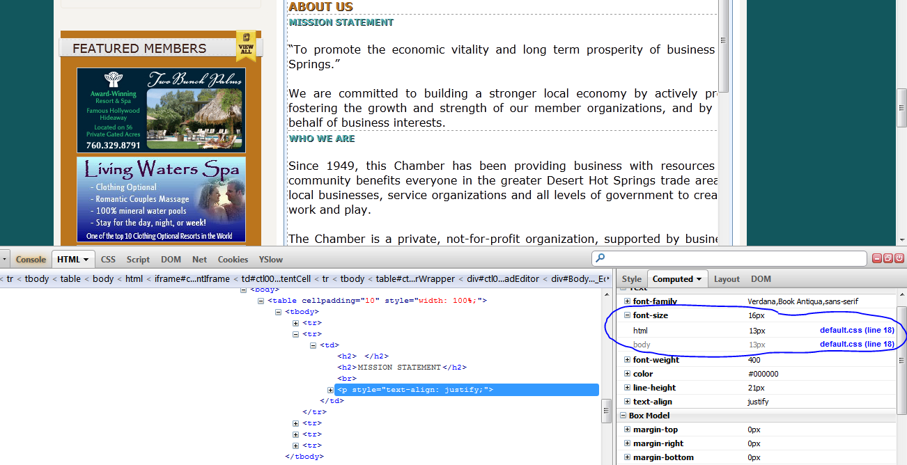 That was the first screen shot I sent. Was a firebug screenshot showing the dynamic css file applying the font size via the html and body tag. They are both set at 13px !important html, body {font-size: 13px !important;} There's more than that but it's margin, padding and standard stuff. When I look at it it shows that the body font-size is not being overwritten but when I look at the p tag it shows 16px instead of the 13px it should be inheriting. I'm sure there's something in there doing that but I just can't find it.