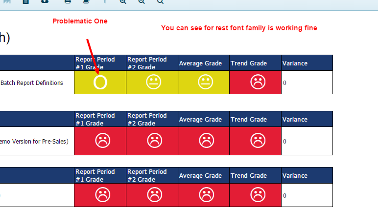 While creating a report we are using Font style to create a smiley but it's not working for the first data. it's working for other data.