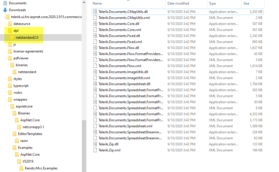 To update, the downloading of the NuGet CLI using the instructions on the Kendo web seemed to accomplish nothing as I could not figure out how to get the files. I accidentally discovered 7-zip would extract the files. However, I had to extract each dpl one by one and then drill down to the correct folder under lib. So after 30 minutes of extra work, I got what I wanted in the first place.See attached.