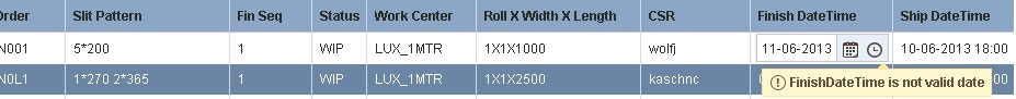 Thanks for your suggestion. It helped me to resolve the date picker formatting issue which I have outside the grid. However, I have a datetimepicker control inside the grid. I am getting the "FinishDateTime is not valid date".