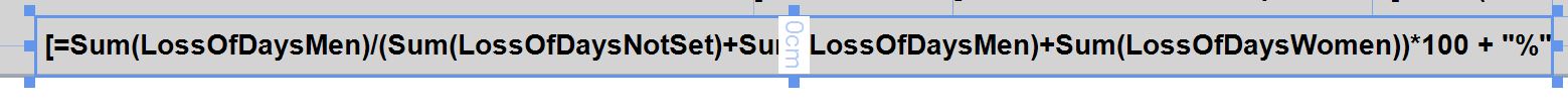 =Sum(LossOfDaysMen)/(Sum(LossOfDaysNotSet)+Sum(LossOfDaysMen)+Sum(LossOfDaysWomen))*100 + "%"
