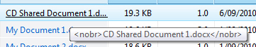 In the column, I had set <nobr> so that it will have only 1 column if i dragged the column width to smaller. But when mouseover the link, the tooltip become <nobr>XXXXX.doc</nobr> not XXXXX.doc. How do I remove the <nobr> or remove the tooltip but still preserve to 1 row event the width turn smaller.