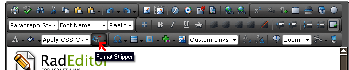 The format stripper dropdown is on the right of the Apply CSS Class dropdown. The Telerik.Web.UI.EditorFilters server enumeration has all the available content filters. By default, all filters except MakeUrlsAbsolute are enabled. For more information, see the RadEditor documentation - http://www.telerik.com/help/aspnet-ajax/contentfilters.html.