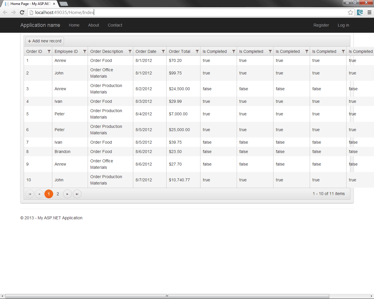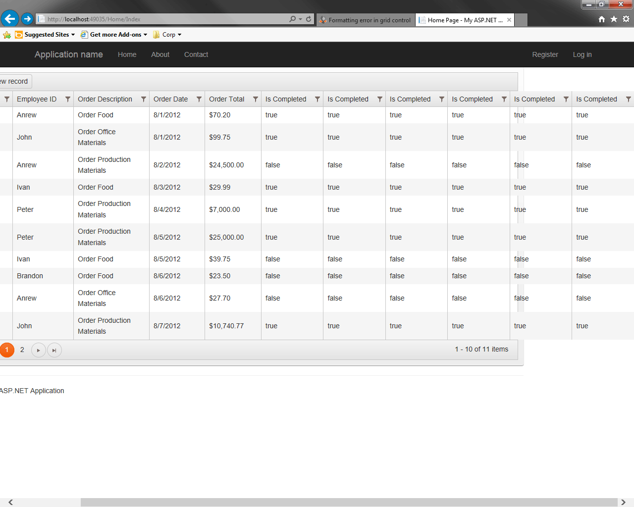 <div class="grid-panel"> @(Html.Kendo().Grid<ForeignKeyColumnDemo.Models.Order>() .Name("grid") .Columns(columns => { columns.Bound(p => p.OrderID); columns.ForeignKey(p => p.EmployeeID, (System.Collections.IEnumerable)ViewData["employees"], "EmployeeID", "Name"); columns.Bound(p => p.OrderDescription); columns.Bound(p => p.OrderDate).Format("{0:d}"); columns.Bound(p => p.OrderTotal).Format("{0:c}"); columns.Bound(p => p.IsCompleted).Width("100px"); columns.Bound(p => p.IsCompleted).Width("100px"); columns.Bound(p => p.IsCompleted).Width("100px"); columns.Bound(p => p.IsCompleted); columns.Bound(p => p.IsCompleted); columns.Bound(p => p.IsCompleted); }) .ToolBar(toolBar => toolBar.Create()) .Pageable() .Sortable() .Filterable() .DataSource(dataSource => dataSource .Ajax() .ServerOperation(false) .Model(model => { model.Id(p => p.OrderID); model.Field(p => p.OrderID).Editable(false); }) .Events(e => e.RequestEnd("onRequestEnd")) .Create(create => create.Action("Create", "Home").Data("sendCulture")) .Destroy(destroy => destroy.Action("Delete", "Home").Data("sendCulture")) .Read(read => read.Action("Read", "Home").Data("sendCulture")) .Update(update => update.Action("Update", "Home").Data("sendCulture"))) )</div>0