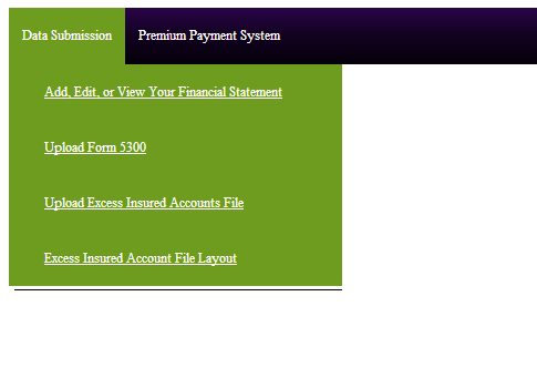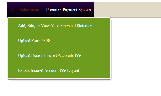 <telerik:RadMenu ID="RadMenu1" runat="server" Width="100%" EnableRoundedCorners="True" EnableShadows="True" EnableTextHTMLEncoding="True" style="z-index:2900" cssclass="RadMenu_ASI"> <Items> <telerik:RadMenuItem runat="server" NavigateUrl="~/finStatement/default.aspx" Text="Data Submission"> <Items> <telerik:RadMenuItem runat="server" NavigateUrl="~/finStatement/fsDefault.aspx" Text="Add, Edit, or View Your Financial Statement"> </telerik:RadMenuItem> <telerik:RadMenuItem runat="server" NavigateUrl="~/finStatement/dataUpload.aspx?format=NCUA" Text="Upload Form 5300"> </telerik:RadMenuItem> <telerik:RadMenuItem runat="server" NavigateUrl="~/finStatement/dataUpload.aspx?format=INS" Text="Upload Excess Insured Accounts File"> </telerik:RadMenuItem> <telerik:RadMenuItem runat="server" NavigateUrl="~/finStatement/InsDescription.aspx" Text="Excess Insured Account File Layout"> </telerik:RadMenuItem> </Items> </telerik:RadMenuItem> <telerik:RadMenuItem runat="server" NavigateUrl="~/premiumPayments/default.aspx" Text="Premium Payment System"> <Items> <telerik:RadMenuItem runat="server" NavigateUrl="~/premiumPayments/demo/SlideShow.aspx" Text="Demo - Premium Payment System "> </telerik:RadMenuItem> <telerik:RadMenuItem runat="server" NavigateUrl="~/premiumPayments/pps.aspx" Text="Premium Payment System Login "> </telerik:RadMenuItem> </Items> </telerik:RadMenuItem> </Items> </telerik:RadMenu>