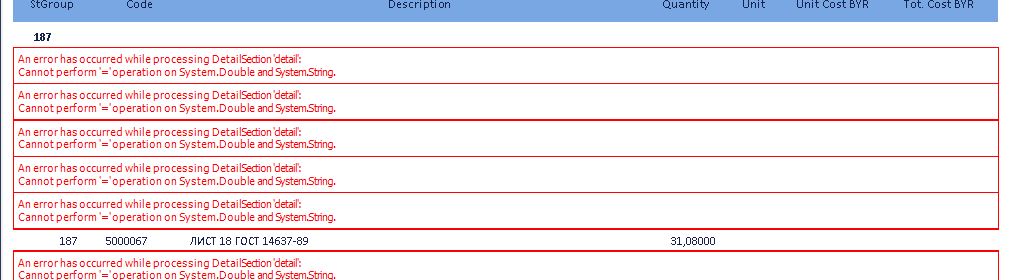 The error I am getting is in the attached picture, however it says "Cannot perform = operation on System.Double and System.String. Same with "Like"