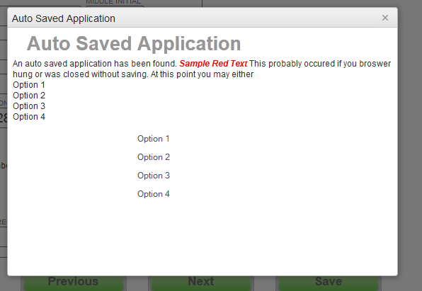 <div id="winAutoSave" data-role="window"> <h1>Auto Saved Application</h1> <p>An auto saved application has been found. <span style=" font-weight: bold; font-style:italic; color: Red;">Sample Red Text</span> This probably occured if you broswer hung or was closed without saving. At this point you may either</p> <ol> <li>Option 1</li> <li>Option 2</li> <li>Option 3</li> <li>Option 4</li> </ol> <div style=" text-align: center; margin-top: 10px; padding-left: 35px;"> <input type="button" value="Option 1" /> <input type="button" value="Option 2" /> <input type="button" value="Option 3" /> <input type="button" value="Option 4" /> </div> <div class="clearAll"></div></div>5 Answers, 1 is accepted