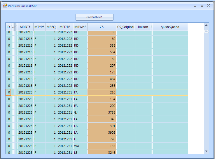 public void LoadDatagridQuery(){ clsDBConn.RemplirGridView(radGridView1, clsDBConn.GetCaissesForcee(), false); radGridView1.EnableAlternatingRowColor = true; // Mettre toutes les colonnes Read-only, sauf les caisses foreach (GridViewDataColumn column in this.radGridView1.Columns) { column.ReadOnly = (column.Name != "CS"); //if (column.Name == "ID") column.IsVisible = false; //Cacher la colonne ID if (column.Name == "DtOrder") column.IsVisible = false; //Cacher la colonne if (column.Name == "CS") column.Width = column.Width * 2; //Agrandir les Caisses } string dtLastTime = ""; bool curVal = true; foreach (GridViewRowInfo row in radGridView1.Rows) { if (row.Cells["MRDTE"].Value.ToString() == dtLastTime) { row.Cells["DtOrder"].Value = curVal ? 0 : 1; } else { dtLastTime = row.Cells["MRDTE"].Value.ToString(); curVal = !curVal; row.Cells["DtOrder"].Value = curVal ? 0 : 1; } }}