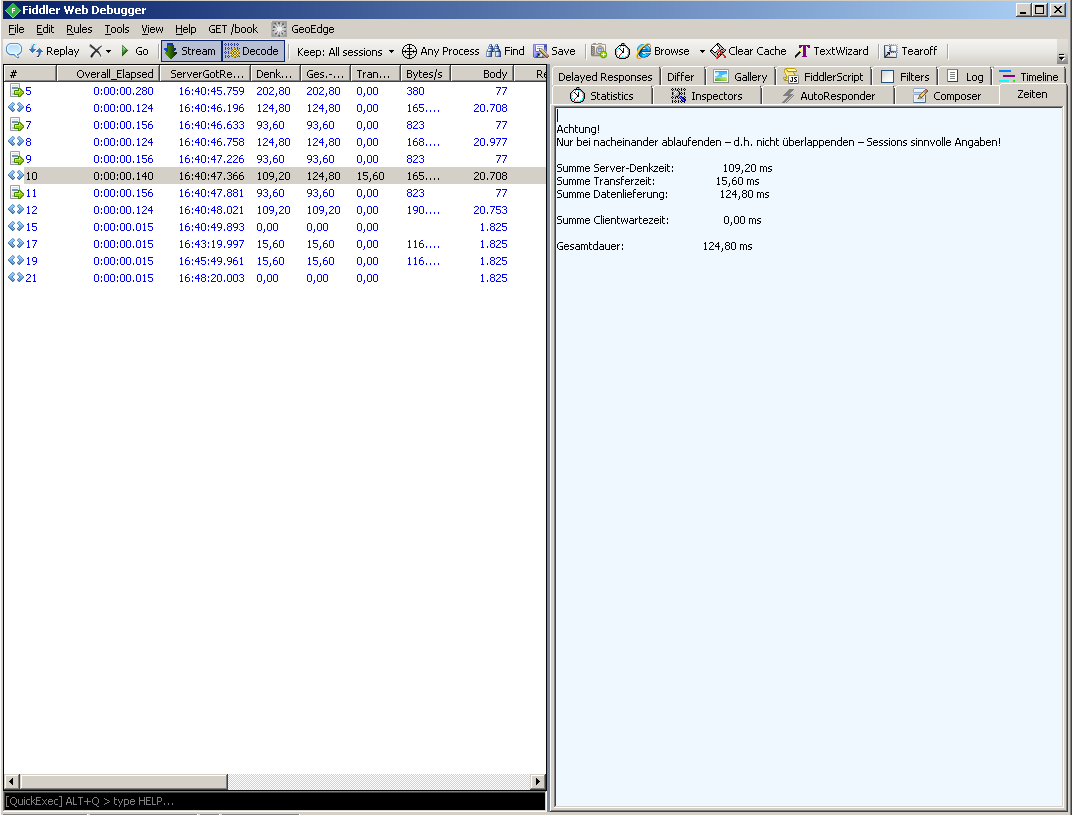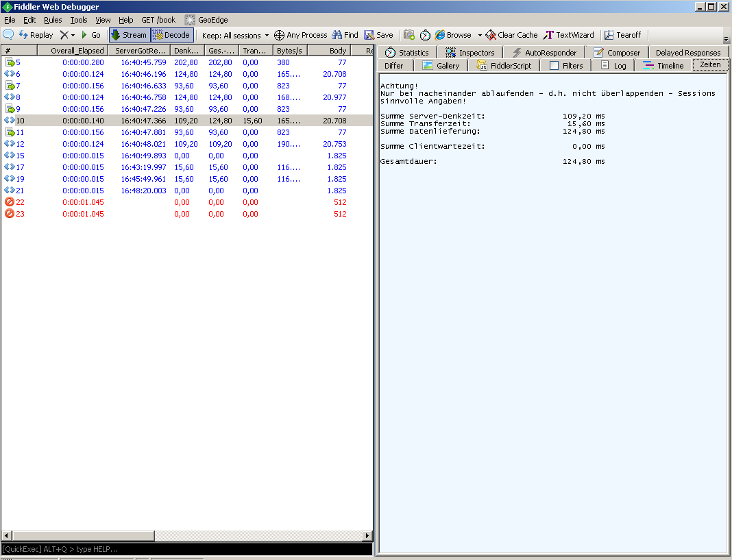 public static BindUIColumn("ServerThinkTime", true)function ServerThinkTime(oS: Session){ var sResult = String.Empty; if (oS.Timers.ServerBeginResponse >= oS.Timers.ServerGotRequest) { // Without the time Fiddler needs sResult = (oS.Timers.ServerBeginResponse - oS.Timers.ServerGotRequest).TotalMilliseconds.ToString("N2"); } return sResult;}2. How can I get the monospaced font in my custom tab (and get it back in the "Statistics" tab)?
