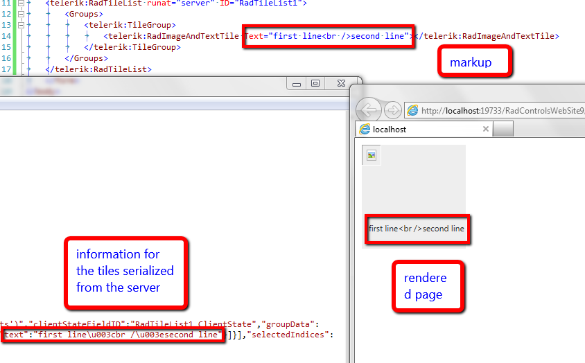 The text for the tiles is escaped and you will see the <br /> symbol instead of a new line. The line will break if it is longer than the available space in the tile.