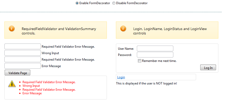Thank you for the clarification. Actually everything is correct. All messages displayed by login and validation controls and decorated by RadFormDecorator are displayed into an element that has a border. See logincontrols.gif attached from the demo page that shows similar messages and how they are displayed.