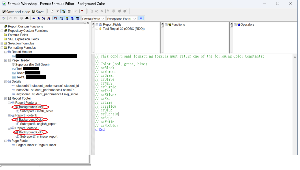 I have converted a Crystal report having multiple sections , each section has its own background color controlled by Formula :Also I have used formula to control data formatting (color) in the original Crystal Report.