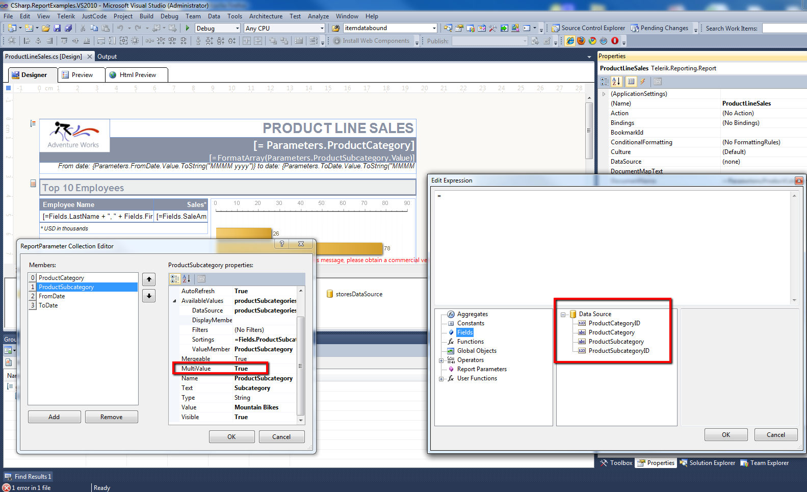 The ProductLineSales demo report that is part of the sample reports we provide with the product has a MultiValue report parameter and the fields of its data source are available in the (see attached screenshot). So there must be something else wrong on your end for this problem to occur and without more information or a sample report we can only guess what is wrong.