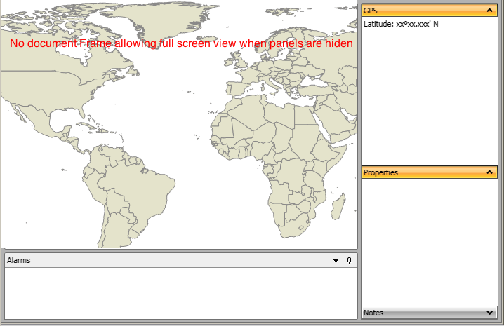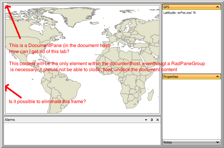 I'm trying to design a full screen interface where static panel with no boundary frames can have a dock panel on the right and on the bottom, but I don't know how to eliminate the header tab in the document pane and eliminate the margin frames.