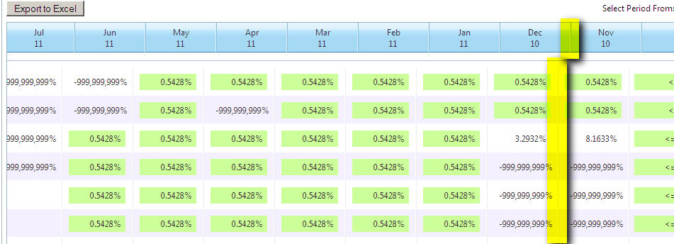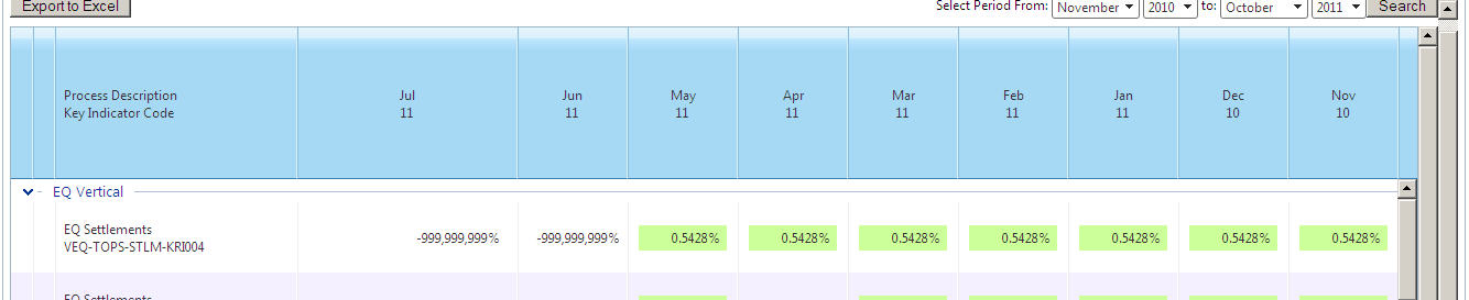 RadGrid1 = new RadGrid();RadGrid1.ID = "RadGrid1";RadGrid1.Height = Unit.Pixel(535);int intDefaultPercentage = 99;bool isFixed = false;if (!ConfigHelper.OPDashboardLayout.Equals("")){ if (ConfigHelper.OPDashboardLayout.ToUpper().Equals("Fixed")) isFixed = true; RadGrid1.MasterTableView.TableLayout = (GridTableLayout)Enum.Parse(typeof(GridTableLayout), ConfigHelper.OPDashboardLayout);}RadGrid1.AutoGenerateColumns = false;RadGrid1.ClientSettings.Scrolling.AllowScroll = true;RadGrid1.ItemDataBound += new GridItemEventHandler(RadGrid1_ItemDataBound);RadGrid1.PreRender += new EventHandler(RadGrid1_PreRender);RadGrid1.ColumnCreated += new GridColumnCreatedEventHandler(RadGrid1_ColumnCreated);RadGrid1.DetailTableDataBind += new GridDetailTableDataBindEventHandler(RadGrid1_DetailTableDataBind);RadGrid1.NeedDataSource += new GridNeedDataSourceEventHandler(RadGrid1_NeedDataSource);RadGrid1.ExcelExportCellFormatting += new OnExcelExportCellFormattingEventHandler(RadGrid1_ExcelExportCellFormatting);RadGrid1.MasterTableView.Name = "Master";RadGrid1.MasterTableView.DataKeyNames = new string[] {"KIID"};RadGrid1.MasterTableView.GroupLoadMode = GridGroupLoadMode.Client;RadGrid1.MasterTableView.Width = Unit.Percentage(intDefaultPercentage);RadGrid1.MasterTableView.HeaderStyle.Wrap = true;if (isFixed){ RadGrid1.CssClass = "AutoShrink"; RadGrid1.MasterTableView.CssClass = "AutoShrink";}//RadGrid1.MasterTableView.HierarchyLoadMode = GridChildLoadMode.Client;GridRelationFields relationFields = new GridRelationFields();relationFields.MasterKeyField = "KIID";relationFields.DetailKeyField = "KIID";RadGrid1.MasterTableView.ParentTableRelation.Add(relationFields);RadGrid1.ClientSettings.AllowGroupExpandCollapse = true;GridGroupByExpression groupExpression = new GridGroupByExpression();GridGroupByField selectField = new GridGroupByField();//selectField.FieldAlias = "Vertical";selectField.HeaderText = " ";selectField.FieldName = "VerticalDisplayName";selectField.HeaderValueSeparator = "";GridGroupByField groupField = new GridGroupByField();groupField.FieldName = "VerticalDisplaySequence";groupExpression.SelectFields.Add(selectField);groupExpression.GroupByFields.Add(groupField);RadGrid1.MasterTableView.GroupByExpressions.Add(groupExpression);#region MasterViewGridBoundColumn processColumn = new GridBoundColumn();processColumn.UniqueName = "ProcessDescription";processColumn.DataField = "ProcessDescription";processColumn.HeaderText = "Process Description" + ApplicationConstant.LINEBREAK + "Key Indicator Code";if (ConfigHelper.OPDashboardWidthProcess > 0) processColumn.HeaderStyle.Width = Unit.Pixel(ConfigHelper.OPDashboardWidthProcess);if (ConfigHelper.OPDashboardResizeRemarks) processColumn.Resizable = false;RadGrid1.MasterTableView.Columns.Add(processColumn);GridBoundColumn KIColumn = new GridBoundColumn();KIColumn.UniqueName = "KI";KIColumn.DataField = "KIDescription";KIColumn.HeaderText = "Key Indicator Description";if (ConfigHelper.OPDashboardWidthKI > 0) KIColumn.HeaderStyle.Width = Unit.Pixel(ConfigHelper.OPDashboardWidthKI);if (ConfigHelper.OPDashboardResizeRemarks) KIColumn.Resizable = false;RadGrid1.MasterTableView.Columns.Add(KIColumn);GridBoundColumn KIColumnHidden = new GridBoundColumn();KIColumnHidden.UniqueName = "KIOriginal";KIColumnHidden.DataField = "KIDescription";if (ConfigHelper.OPDashboardWidthKI > 0) KIColumn.HeaderStyle.Width = Unit.Pixel(ConfigHelper.OPDashboardWidthKI);KIColumnHidden.Visible = false;RadGrid1.MasterTableView.Columns.Add(KIColumnHidden);GridBoundColumn remarksColumn = new GridBoundColumn();remarksColumn.UniqueName = "Remarks";remarksColumn.DataField = "Remarks";remarksColumn.HeaderText = "Remarks";if (ConfigHelper.OPDashboardWidthRemarks > 0) remarksColumn.HeaderStyle.Width = Unit.Pixel(ConfigHelper.OPDashboardWidthRemarks);RadGrid1.MasterTableView.Columns.Add(remarksColumn);GridBoundColumn remarksColumnHidden = new GridBoundColumn();remarksColumnHidden.UniqueName = "RemarksOriginal";remarksColumnHidden.DataField = "Remarks";remarksColumnHidden.Visible = false;if (ConfigHelper.OPDashboardWidthRemarks > 0) remarksColumn.HeaderStyle.Width = Unit.Pixel(ConfigHelper.OPDashboardWidthRemarks);RadGrid1.MasterTableView.Columns.Add(remarksColumnHidden);for (int i = 1; i <= int.Parse(ConfigHelper.OPDashboardMaxPeriodRange); i++){ GridTemplateColumn masterPeriodColumn = new GridTemplateColumn(); masterPeriodColumn.UniqueName = PERIODCOLUMNPREFIX + i.ToString(); masterPeriodColumn.ItemTemplate = new KRIPeriodTemplateColumn(i.ToString()); masterPeriodColumn.HeaderStyle.HorizontalAlign = HorizontalAlign.Center; if (ConfigHelper.OPDashboardWidthMonths > 0) masterPeriodColumn.HeaderStyle.Width = Unit.Pixel(ConfigHelper.OPDashboardWidthMonths); masterPeriodColumn.HeaderStyle.Wrap = true; if (ConfigHelper.OPDashboardResizeRemarks) masterPeriodColumn.Resizable = false; RadGrid1.MasterTableView.Columns.Add(masterPeriodColumn);}GridTemplateColumn thresholdColumn = new GridTemplateColumn();thresholdColumn.UniqueName = "ThresholdColumn";thresholdColumn.ItemTemplate = new KRIThresholdTemplateColumn();thresholdColumn.Visible = blnShowThreshold;if (ConfigHelper.OPDashboardWidthThreshold > 0) thresholdColumn.HeaderStyle.Width = Unit.Pixel(ConfigHelper.OPDashboardWidthThreshold);//thresholdColumn.HeaderText = "Threshold";thresholdColumn.HeaderText = "Threshold" + ApplicationConstant.LINEBREAK + "(in $)";thresholdColumn.HeaderStyle.HorizontalAlign = HorizontalAlign.Center;thresholdColumn.HeaderStyle.Wrap = true;if (ConfigHelper.OPDashboardResizeRemarks) thresholdColumn.Resizable = false;RadGrid1.MasterTableView.Columns.Add(thresholdColumn);#endregion#region DetailViewGridTableView tableView1 = new GridTableView();tableView1.Name = "Detail";tableView1.DataKeyNames = new string[] { "KIID","AssetTypeCode" };tableView1.Width = Unit.Percentage(intDefaultPercentage);tableView1.HeaderStyle.Wrap = true;RadGrid1.MasterTableView.DetailTables.Add(tableView1);GridBoundColumn assetDescriptionColumn = new GridBoundColum