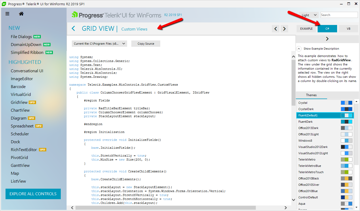 The example code is available in the demo application (see attached). There is a Visual Studio solution with all examples in the installation folder: C:\Program Files (x86)\Progress\Telerik UI for WinForms R2 2019\Examples\QuickStart