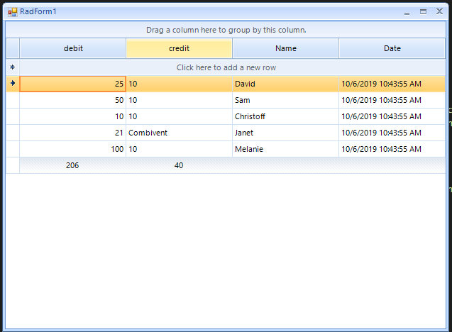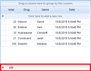 GridViewSummaryRowItem summary =new GridViewSummaryRowItem();summary.Add(new GridViewSummaryItem("total", "{0:#,###}", GridAggregateFunction.Sum));productGrid.SummaryRowsTop.Add(summary) ;this.productGrid.MasterTemplate.ShowTotals = true;this.productGrid.MasterView.SummaryRows[0].PinPosition = PinnedRowPosition.Bottom;9 Answers, 1 is accepted