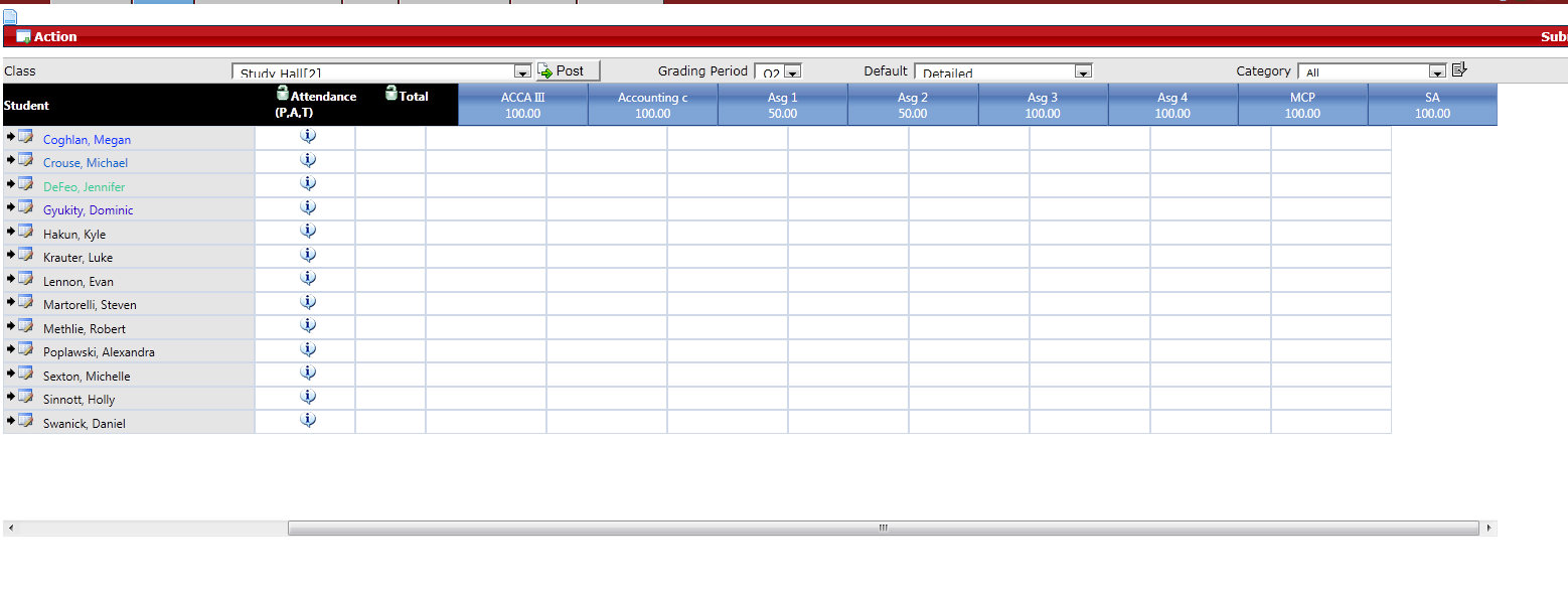 <td> <table cellspacing="0" cellpadding="0" border="0" width="100%" id="Table4"> <tbody><tr> <td id="GridTD"> <div id="ctl00_cphMain_ctl00_cphMain_RadGrid1Panel" style="display: block;"> <div style="height: 450px; width: 1560px;" onkeydown="onKeyDown(this,event);" class="RadGrid RadGrid_Web20 AutoShrink" id="ctl00_cphMain_RadGrid1" tabindex="0"> <div style="overflow: hidden; width: 100%;" class="rgHeaderDiv" id="ctl00_cphMain_RadGrid1_GridHeader"> <table cellspacing="0" border="0" style="width: 100%; overflow: hidden; empty-cells: show; table-layout: fixed;" id="ctl00_cphMain_RadGrid1_ctl00_Header" class="rgMasterTable AutoShrink rgClipCells"> <colgroup> <col style="width:250px"> <col style="width:100px"> <col style="width:70px"> <col style="width: 70px;"> <col style="width: 70px;"> <col style="width: 110px;"> <col style="width:120px"> <col style="width:120px"> <col style="width:120px"> <col style="width:120px"> <col style="width:120px"> <col style="width:120px"> <col style="width:120px"> <col style="width:120px"> <col style="width:120px"> </colgroup> <thead> <tr> <th valign="middle" style="color:White;background-color:Black;" scope="col"><span>Student</span><input type="hidden" name="ctl00$cphMain$RadGrid1$ctl00$ctl02$ctl00$ctl02" tabindex="26"><input type="hidden" value="-1" name="ctl00$cphMain$RadGrid1$ctl00$ctl02$ctl00$ctl03" tabindex="27"></th><th valign="top" style="color:White;background-color:Black;" title="Attendance" scope="col"><a href="javascript:__doPostBack('ctl00$cphMain$RadGrid1$ctl00$ctl02$ctl00$ctl04','')"><img border="0" src="../../images/icons/Unlockicon.gif"></a><span>Attendance <br> (P,A,T)</span><input type="hidden" name="ctl00$cphMain$RadGrid1$ctl00$ctl02$ctl00$ctl06" tabindex="28"><input type="hidden" value="0" name="ctl00$cphMain$RadGrid1$ctl00$ctl02$ctl00$ctl07" tabindex="29"></th><th valign="top" style="color:White;background-color:Black;" title="Total" scope="col"><a href="javascript:__doPostBack('ctl00$cphMain$RadGrid1$ctl00$ctl02$ctl00$ctl08','')"><img border="0" src="../../images/icons/Unlockicon.gif"></a><span>Total</span><input type="hidden" name="ctl00$cphMain$RadGrid1$ctl00$ctl02$ctl00$ctl10" tabindex="30"><input type="hidden" value="0" name="ctl00$cphMain$RadGrid1$ctl00$ctl02$ctl00$ctl11" tabindex="31"></th><th valign="top" style="color: White; background-color: Black; display: table-cell;" title="Mean" scope="col"><a href="javascript:__doPostBack('ctl00$cphMain$RadGrid1$ctl00$ctl02$ctl00$ctl12','')"><img border="0" src="../../images/icons/Unlockicon.gif"></a><span>Mean</span><input type="hidden" name="ctl00$cphMain$RadGrid1$ctl00$ctl02$ctl00$ctl14" tabindex="32"><input type="hidden" value="0" name="ctl00$cphMain$RadGrid1$ctl00$ctl02$ctl00$ctl15" tabindex="33"></th><th valign="top" style="color: White; background-color: Black; display: table-cell;" title="Median" scope="col"><a href="javascript:__doPostBack('ctl00$cphMain$RadGrid1$ctl00$ctl02$ctl00$ctl16','')"><img border="0" src="../../images/icons/Unlockicon.gif"></a><span>Median</span><input type="hidden" name="ctl00$cphMain$RadGrid1$ctl00$ctl02$ctl00$ctl18" tabindex="34"><input type="hidden" value="0" name="ctl00$cphMain$RadGrid1$ctl00$ctl02$ctl00$ctl19" tabindex="35"></th><th valign="top" style="color: White; background-color: Black; display: table-cell;" scope="col"><a href="javascript:__doPostBack('ctl00$cphMain$RadGrid1$ctl00$ctl02$ctl00$ctl20','')"><img border="0" src="../../images/icons/Unlockicon.gif"></a><span>Final</span><input type="hidden" value="1649,3649,497,2215,678,429,3653,298,1220,644,3514,704,3611" name="ctl00$cphMain$RadGrid1$ctl00$ctl02$ctl00$ctl22" tabindex="36"><input type="hidden" value="444" name="ctl00$cphMain$RadGrid1$ctl00$ctl02$ctl00$ctl23" tabindex="37"></th><th valign="top" style="text-align:center;" class="rgHeader" title="ACCA II" scope="col"><input type="hidden" value="107999|MMAlam 2" name="ctl00$cphMain$RadGrid1$ctl00$ctl02$ctl00$ctl24" tabindex="38"><input type="hidden" value="1649,3649,497,2215,678,429,3653,298,1220,644,3514,704,3611" name="ctl00$cphMain$RadGrid1$ctl00$ctl02$ctl00$ctl25" tabindex="39"><span>ACCA II<br style="display:none"><br style="display:">100.00</span><input type="hidden" value="False" name="ctl00$cphMain$RadGrid1$ctl00$ctl02$ctl00$ctl27" tabindex="40"><input type="hidden" value="444" name="ctl00$cphMain$RadGrid1$ctl00$ctl02$ctl00$ctl28" tabindex="41"><input type="hidden" name="ctl00$cphMain$RadGrid1$ctl00$ctl02$ctl00$ctl29" tabindex="42"><input type="hidden" value="ACCA II|True|False|107999|#99CC33" id="ctl00_cphMain_RadGrid1_ctl00_ctl02_ctl00_hdAssignmentHeaderAttributes107999" name="ctl00$cphMain$RadGrid1$ctl00$ctl02$ctl00$hdAssignmentHeaderAttributes107999" tabindex="43"><input type="hidden" value="100.00" name="ctl00$cphMain$RadGrid1$ctl00$ctl02$ctl00$ctl30" tabindex="44"><input type="hidden" value="True" name="ctl00$cphMain$RadGrid1$ctl00$ctl02$ctl00$ctl31" tabindex="45"></th><th valign="top" style="text-align:center;" class="rgHeader" title="ACCA III" scope="col"><input type="hidden" value="108000|MMAlam 2" name="ctl00$cphMain$RadGrid1$ctl00$ctl02$ctl00$ctl32" tabindex="46"><input type="hidden" value="1649,3649,497,2215,678,429,3653,298,1220,644,3514,704,3611" name="ctl00$cphMain$RadGrid1$ctl00$ctl02$ctl00$ctl33" tabindex="47"><span>ACCA III<br style="display:none"><br style="display:">100.00</span><input type="hidden" value="False" name="ctl00$cphMain$RadGrid1$ctl00$ctl02$ctl00$ctl35" tabindex="48"><input type="hidden" value="444" name="ctl00$cphMain$RadGrid1$ctl00$ctl02$ctl00$ctl36" tabindex="49"><input type="hidden" name="ctl00$cphMain$RadGrid1$ctl00$ctl02$ctl00$ctl37" tabindex="50"><input type="hidden" value="ACCA III|True|False|108000|#99CC33" id="ctl00_cphMain_RadGrid1_ctl00_ctl02_ctl00_hdAssignmentHeaderAttributes108000" name="ctl00$cphMain$RadGrid1$ctl00$ctl02$ctl00$hdAssignmentHeaderAttributes108000" tabindex="51"><input type="hidden" value="100.00" name="ctl00$cphMain$RadGrid1$ctl00$ctl02$ctl00$ctl38" tabindex="52"><input t
