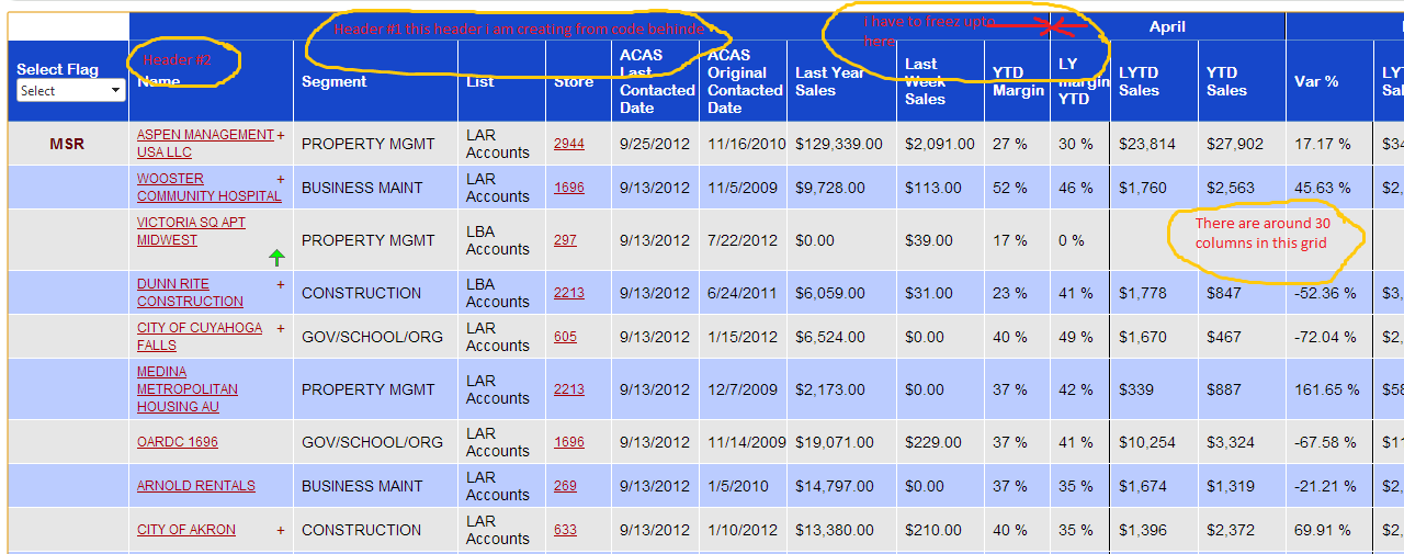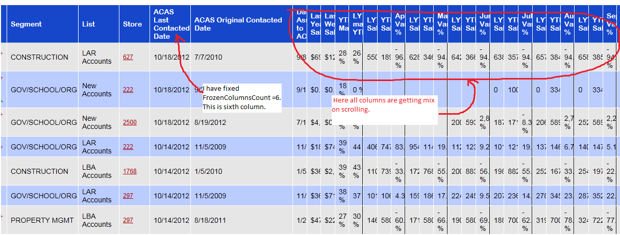 In our requirement we have total 30 columns and now we our "FrozenColumnsCount =6 " and rest can scroll this is working for all browsers apart from IE 9. Even it's working in IE 7 and 8 also. I am sending the screen shot . Please look at this.