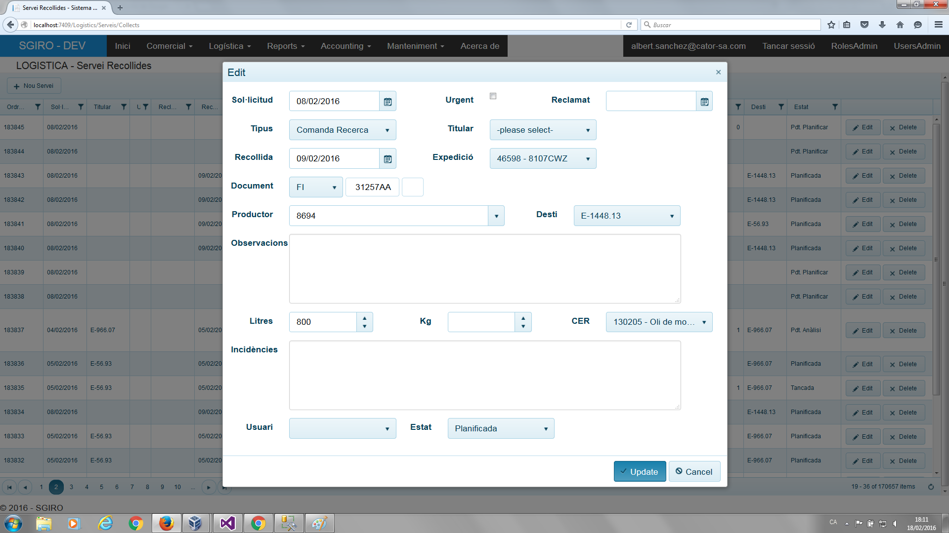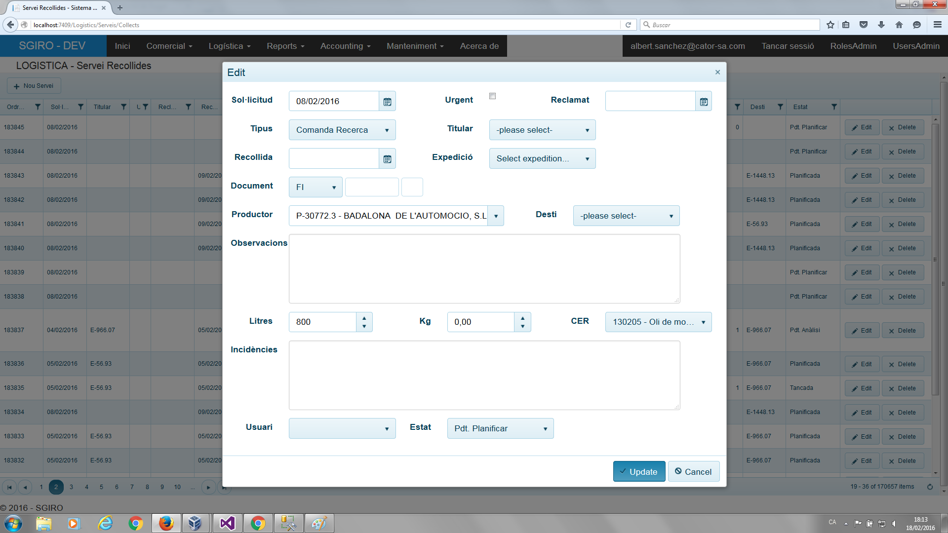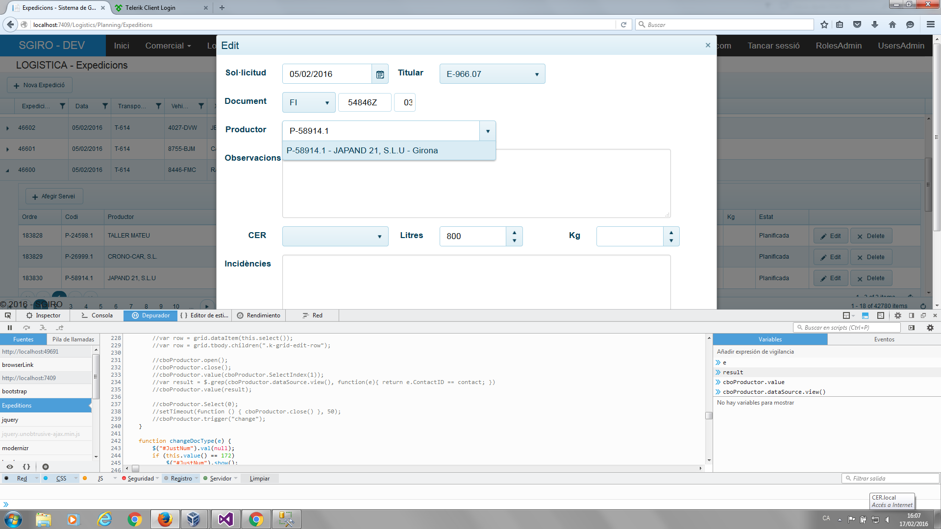 <div class="container-fluid"> <div class="row"> <div class="form-horizontal col-md-12" style="width:905px"> @Html.ValidationSummary(true, "", new { @class = "text-danger" }) <div class="form-group"> @Html.LabelFor(model => model.DataOrdre, new { @class = "col-md-1 control-label" }) <div class="col-md-2"> @Html.EditorFor(model => model.DataOrdre) </div> @Html.LabelFor(model => model.HolderID, new { @class = "col-md-1 control-label" }) <div class="col-md-2"> @Html.EditorFor(model => model.HolderID) </div> </div> <div class="form-group"> @Html.LabelFor(model => model.DocTypeID, new { @class = "col-md-1 control-label" }) <div class="col-md-1"> @Html.EditorFor(model => model.DocTypeID) </div> <div class="col-md-1"> @Html.Kendo().TextBoxFor(m => m).Name("DocNum").HtmlAttributes(new { style = "width:100px" }) </div> <div class="col-md-1"> @Html.Kendo().TextBoxFor(m => m).Name("JustNum").HtmlAttributes(new { style = "width:40px", maxlength = "2" }) </div> </div> <div class="form-group"> @Html.LabelFor(model => model.ProductorID, new { @class = "col-md-1 control-label" }) <div class="col-md-4"> @Html.EditorFor(model => model.ProductorID) </div> </div> <div class="form-group"> @Html.LabelFor(model => model.Observacions, new { @class = "col-md-1 control-label" }) <div class="col-md-9"> @Html.TextAreaFor(model => model.Observacions, new { @class = "form-control", @rows = 5 }) </div> </div> <div class="form-group"> @Html.LabelFor(model => model.Reference, new { @class = "col-md-1 control-label" }) <div class="col-md-2"> @Html.EditorFor(model => model.Reference) </div> @Html.LabelFor(model => model.Litres, new { @class = "col-md-1 control-label" }) <div class="col-md-2"> @Html.EditorFor(model => model.Litres) </div> @Html.LabelFor(model => model.Kg, new { @class = "col-md-1 control-label" }) <div class="col-md-2"> @Html.EditorFor(model => model.Kg) </div> </div> <div class="form-group"> @Html.LabelFor(model => model.Incidencies, new { @class = "col-md-1 control-label" }) <div class="col-md-9"> @Html.TextAreaFor(model => model.Incidencies, new { @class = "form-control", @rows = 5 }) </div> </div> <div class="form-group"> @Html.LabelFor(model => model.OwnerID, new { @class = "col-md-1 control-label" }) <div class="col-md-2"> @Html.EditorFor(model => model.OwnerID) </div> @Html.LabelFor(model => model.StateID, new { @class = "col-md-1 control-label" }) <div class="col-md-2"> @Html.EditorFor(model => model.StateID) </div> </div> </div> </div></div>