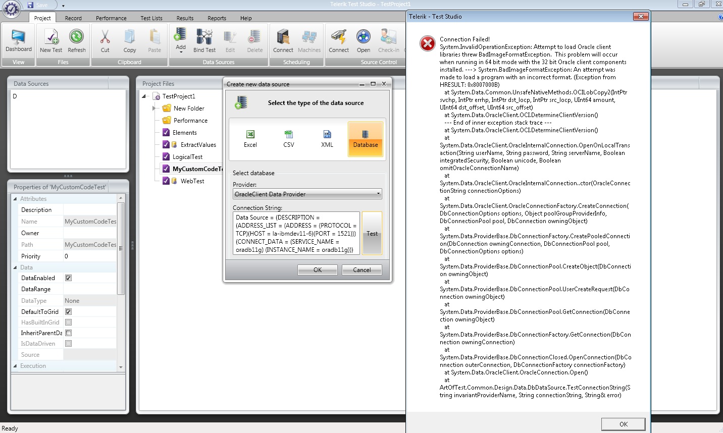 while adding datasource....i hav selected oracle client data provider...given appropraite connection string to connect...but still connection is throwing us error...