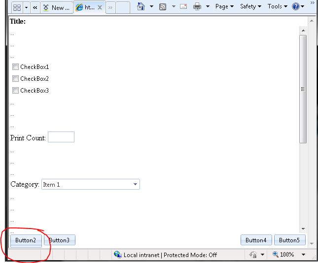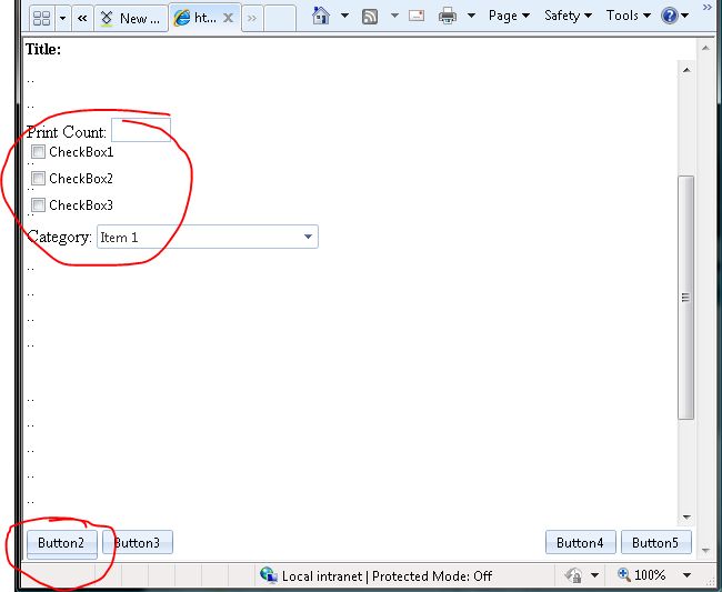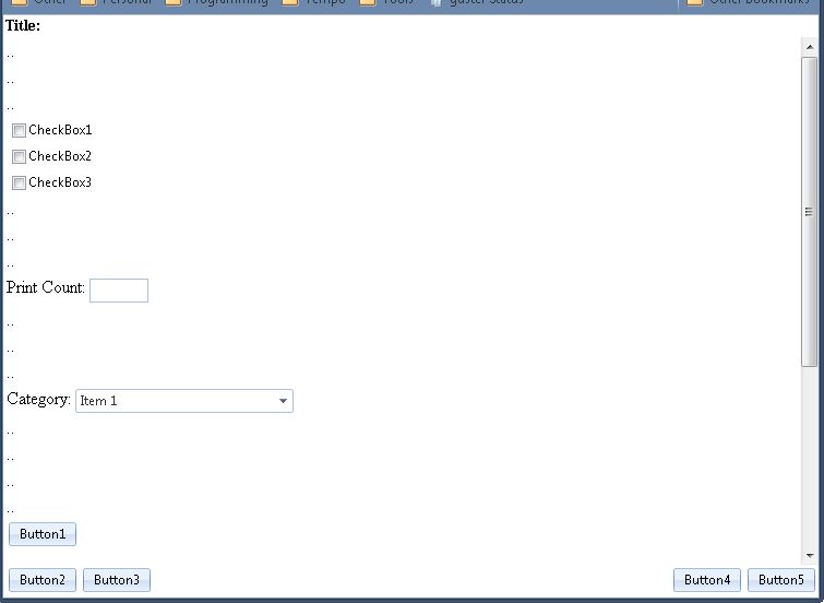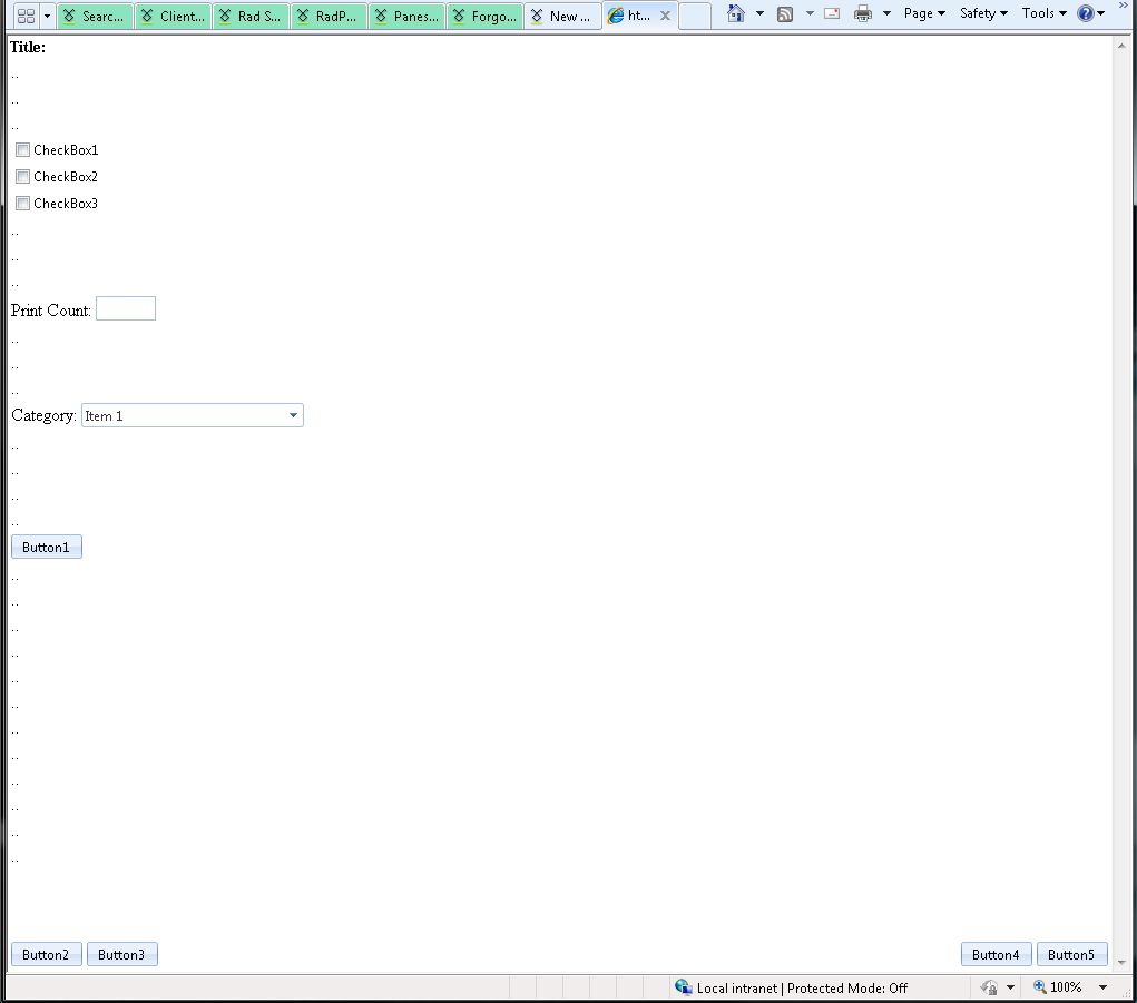 <%@ Page Language="VB" AutoEventWireup="false" CodeBehind="Sample.aspx.vb" Inherits="RadControlsWebApp1.Sample" %> <!DOCTYPE html PUBLIC "-//W3C//DTD XHTML 1.0 Transitional//EN" "http://www.w3.org/TR/xhtml1/DTD/xhtml1-transitional.dtd"> <html xmlns="http://www.w3.org/1999/xhtml" style="width: 100%; height: 100%; margin: 0px auto; padding: 0px;"> <head runat="server"> <title></title> <telerik:RadStyleSheetManager ID="RadStyleSheetManager1" runat="server" /> </head> <body style="width: 100%; height: 100%; margin: 0px auto; padding: 0px;"> <form id="form1" runat="server" style="width: 100%; height: 100%; margin: 0px auto; padding: 0px;"> <telerik:RadScriptManager ID="RadScriptManager1" runat="server"> <Scripts> <%--Needed for JavaScript IntelliSense in VS2010--%> <%--For VS2008 replace RadScriptManager with ScriptManager--%> <asp:ScriptReference Assembly="Telerik.Web.UI" Name="Telerik.Web.UI.Common.Core.js" /> <asp:ScriptReference Assembly="Telerik.Web.UI" Name="Telerik.Web.UI.Common.jQuery.js" /> <asp:ScriptReference Assembly="Telerik.Web.UI" Name="Telerik.Web.UI.Common.jQueryInclude.js" /> </Scripts> </telerik:RadScriptManager> <script type="text/javascript"> </script> <telerik:RadAjaxManager ID="RadAjaxManager1" runat="server"> </telerik:RadAjaxManager> <telerik:RadSkinManager ID="RadSkinManager1" runat="server" Skin="Office2007"> </telerik:RadSkinManager> <div style="width: 100%; height: 100%;"> <telerik:RadSplitter ID="RadSplitter1" runat="server" Width="100%" Height="100%" Orientation="Horizontal" VisibleDuringInit="false" BorderSize="0"> <telerik:RadPane ID="RadPane1" runat="server" Height="20" Locked="true"> <span style="vertical-align: middle; font-size: 14px; font-weight: bold; margin: 2px;">Title:</span> </telerik:RadPane> <telerik:RadPane ID="RadPane2" runat="server" Height="100%"> <div style="height: 100%;"> <table> <tr> <td> .. </td> </tr> <tr> <td> .. </td> </tr> <tr> <td> .. </td> </tr> <tr> <td> <telerik:RadButton ID="CheckBox1" runat="server" ButtonType="ToggleButton" ToggleType="CheckBox" Text="CheckBox1" /> </td> </tr> <tr> <td> <telerik:RadButton ID="CheckBox2" runat="server" ButtonType="ToggleButton" ToggleType="CheckBox" Text="CheckBox2" /> </td> </tr> <tr> <td> <telerik:RadButton ID="CheckBox3" runat="server" ButtonType="ToggleButton" ToggleType="CheckBox" Text="CheckBox3" /> </td> </tr> <tr> <td> .. </td> </tr> <tr> <td> .. </td> </tr> <tr> <td> .. </td> </tr> <tr> <td> Print Count: <telerik:RadNumericTextBox ID="NumericTextBox1" runat="server" NumberFormat-DecimalDigits="0" MaxValue="99" MinValue="0" Width="50" ShowSpinButtons="false" /> </td> </tr> <tr> <td> .. </td> </tr> <tr> <td> .. </td> </tr> <tr> <td> .. </td> </tr> <tr> <td> Category: <telerik:RadComboBox ID="ComboBox1" runat="server" Width="200px"> <Items> <telerik:RadComboBoxItem Text="Item 1" /> <telerik:RadComboBoxItem Text="Item 2" /> <telerik:RadComboBoxItem Text="Item 3" /> </Items> </telerik:RadComboBox> </td> </tr> <tr> <td> .. </td> </tr> <tr> <td> .. </td> </tr> <tr> <td> .. </td> </tr> <tr> <td> .. </td> </tr> <tr> <td> <telerik:RadButton ID="RadButton1" runat="server" Text="Button1" /> </td> </tr> <tr> <td> .. </td> </tr> <tr> <td> .. </td> </tr> <tr> <td> .. </td> </tr> <tr> <td> .. </td> </tr> <tr> <td> .. </td> </tr> <tr> <td> .. </td> </tr> <tr> <td> .. </td> </tr> <tr> <td> .. </td> </tr> <tr> <td> .. </td> </tr> <tr> <td> .. </td> </tr> <tr> <td> .. </td> </tr> <tr> <td> .. </td> </tr> </table> </div> </telerik:RadPane> <telerik:RadPane ID="RadPane3" runat="server" Height="30" Locked="true"> <table width="100%"> <tr> <td> <telerik:RadButton ID="RadButton2" runat="server" Text="Button2" AutoPostBack="false" /> <telerik:RadButton ID="RadButton3" runat="server" Text="Button3" AutoPostBack="false" /> </td> <td style="text-align: right"> <telerik:RadButton ID="RadButton4" runat="server" Text="Button4" AutoPostBack="false" /> <telerik:RadButton ID="RadButton5" runat="server" Text="Button5" AutoPostBack="false" /> </td> </tr> </table> </telerik:RadPane> </telerik:RadSplitter> </div> </form> </body> </html>